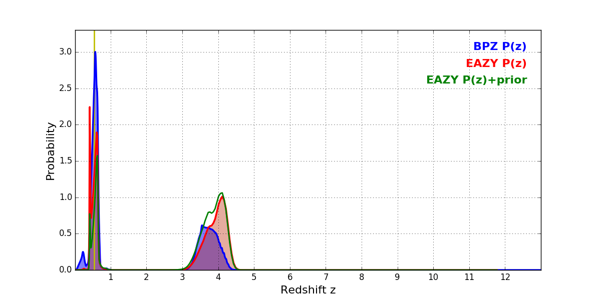 In P(z) plots: Yellow lines mark the cluster redshift z = 0.546,