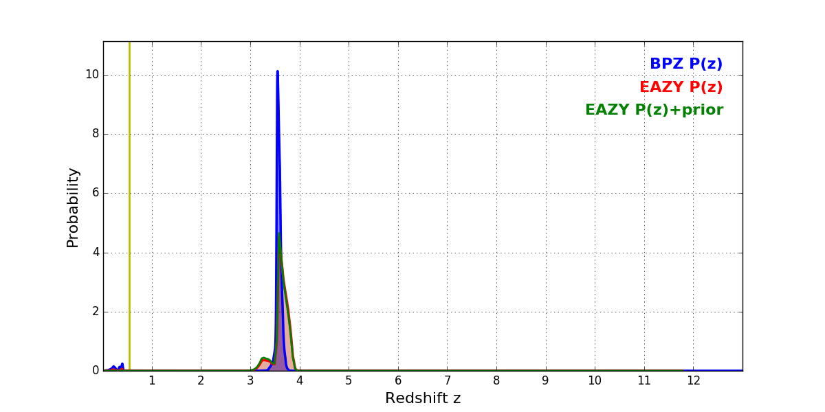 In P(z) plots: Yellow lines mark the cluster redshift z = 0.546,