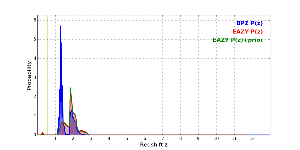 In P(z) plots: Yellow lines mark the cluster redshift z = 0.546,