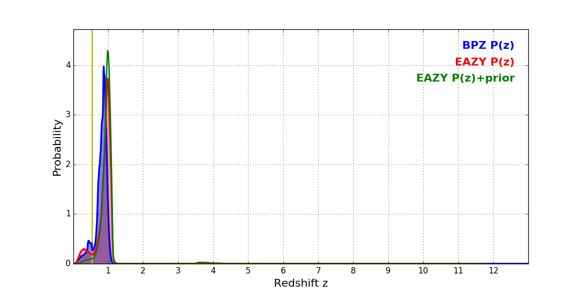In P(z) plots: Yellow lines mark the cluster redshift z = 0.546,
