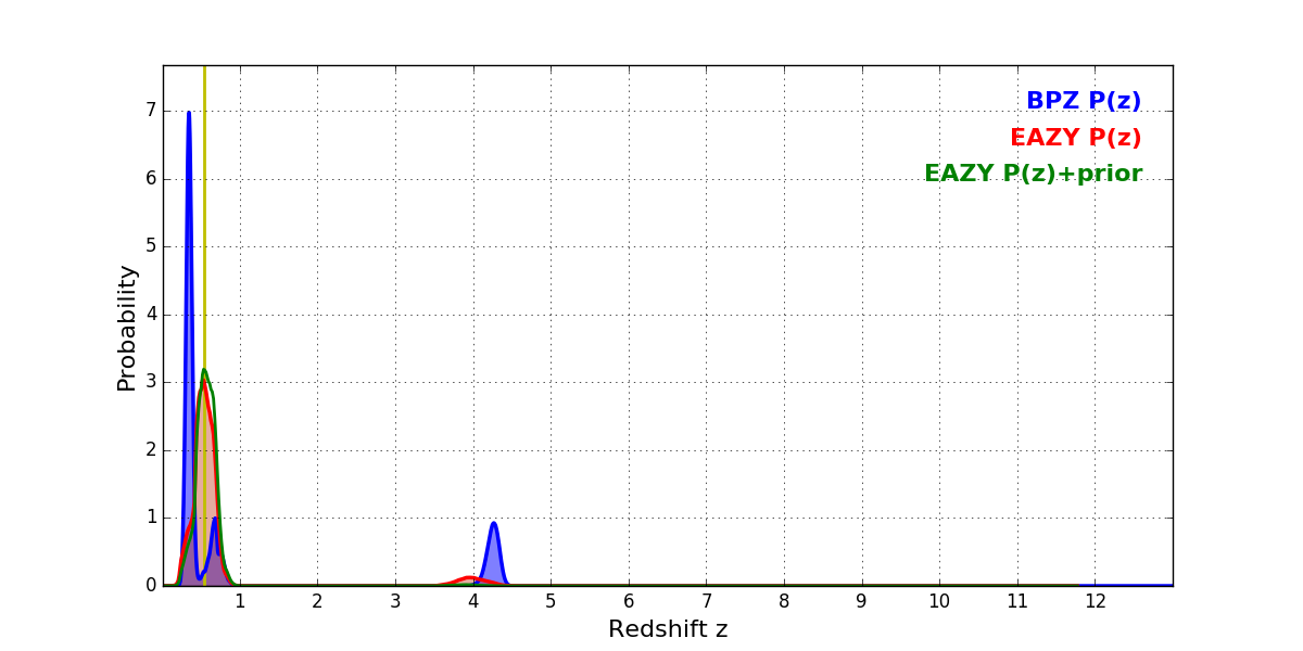 In P(z) plots: Yellow lines mark the cluster redshift z = 0.546,