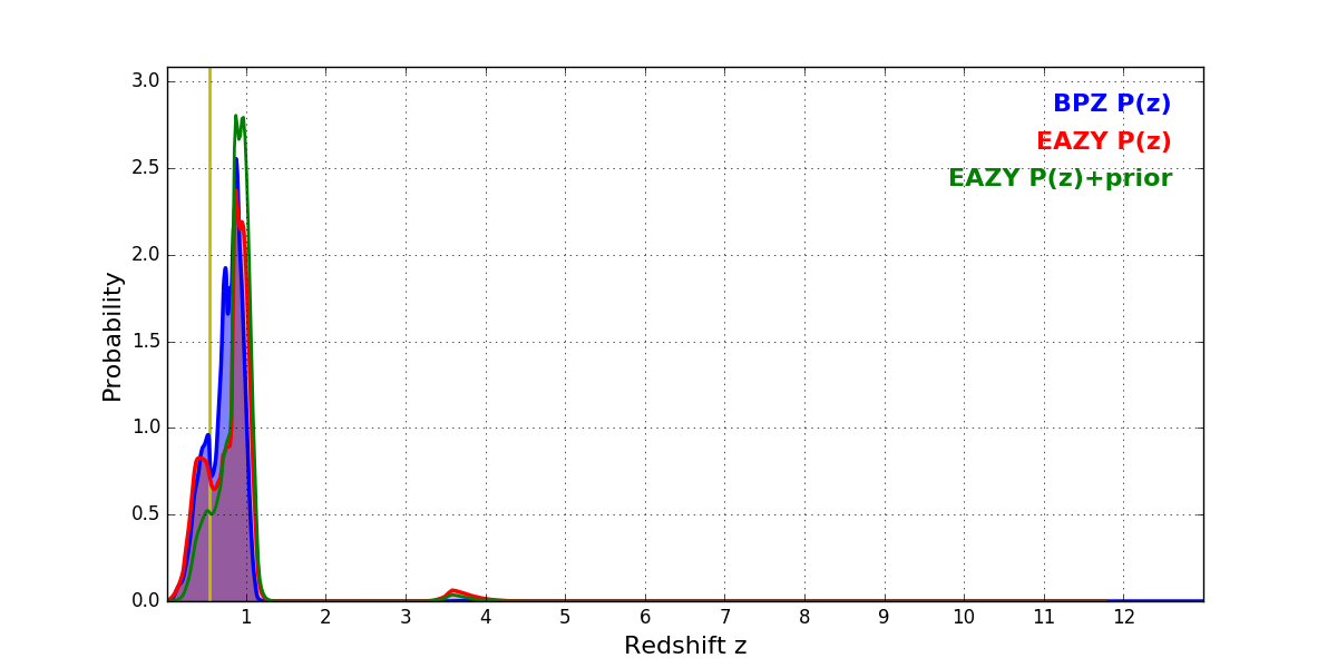 In P(z) plots: Yellow lines mark the cluster redshift z = 0.546,