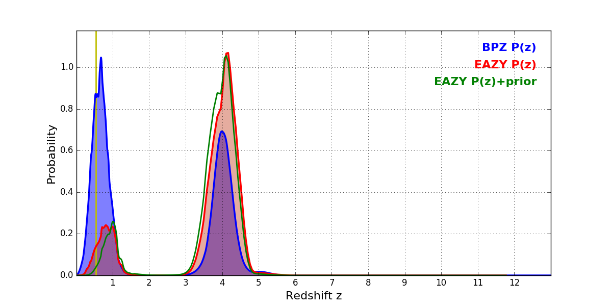In P(z) plots: Yellow lines mark the cluster redshift z = 0.546,