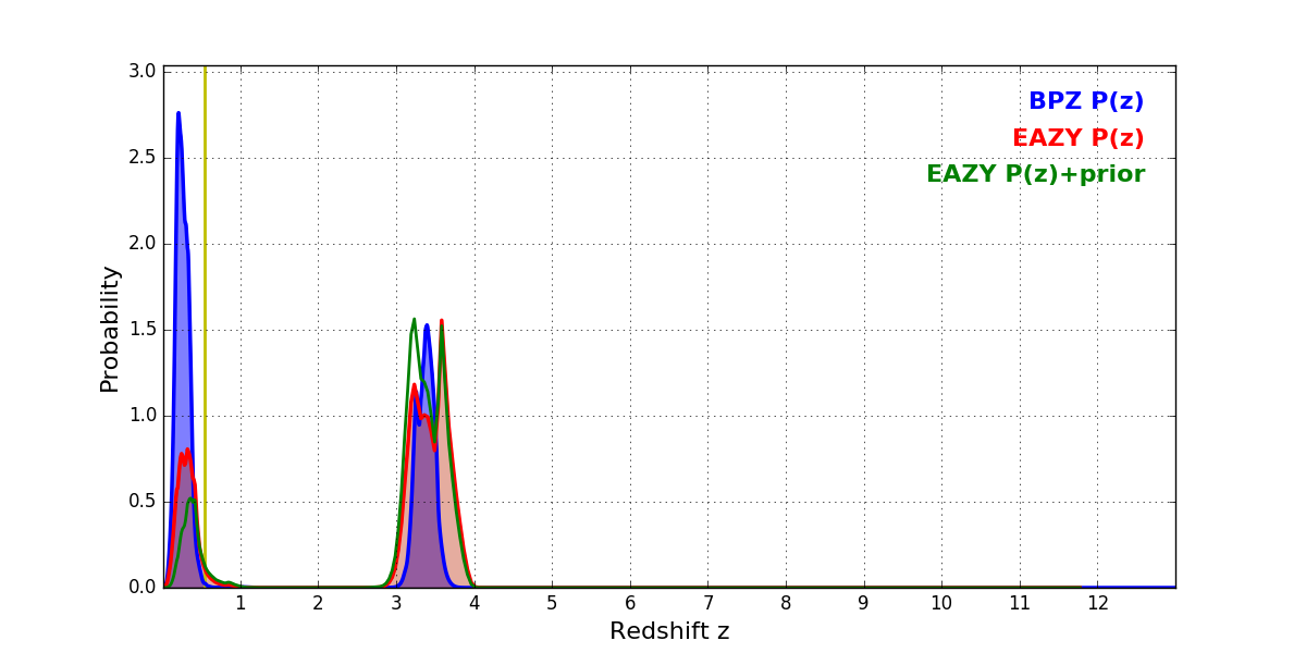 In P(z) plots: Yellow lines mark the cluster redshift z = 0.546,