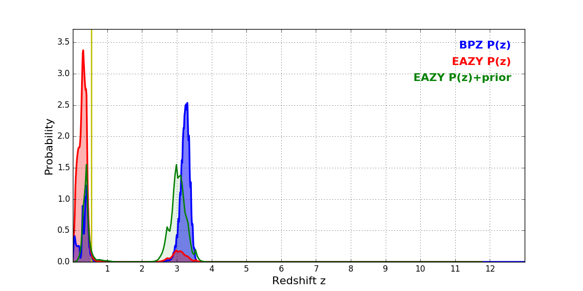In P(z) plots: Yellow lines mark the cluster redshift z = 0.546,