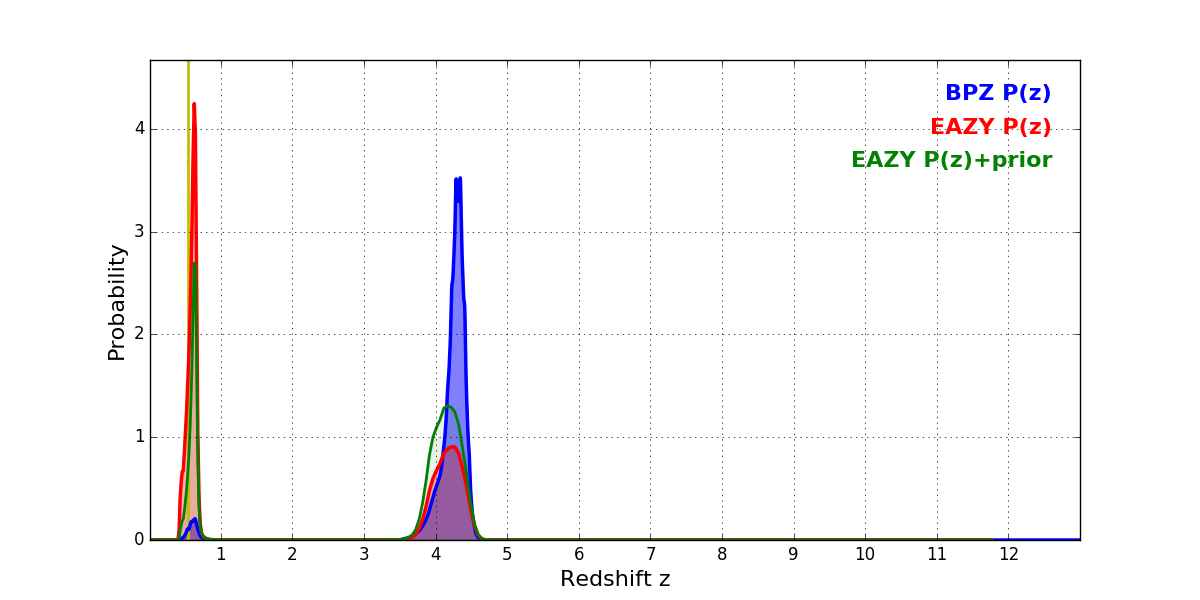 In P(z) plots: Yellow lines mark the cluster redshift z = 0.546,