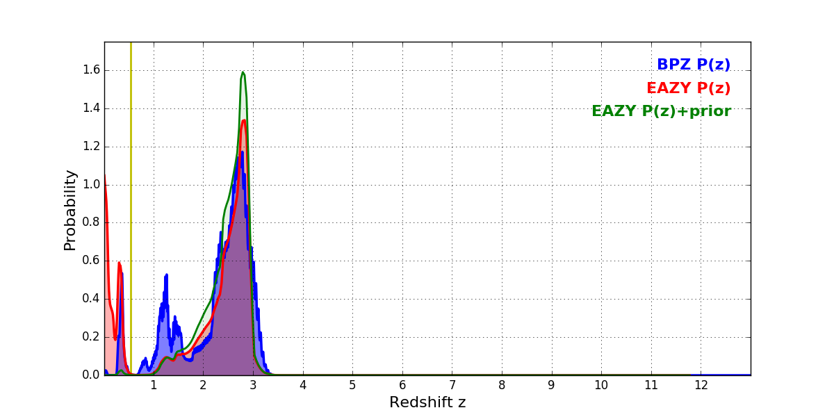 In P(z) plots: Yellow lines mark the cluster redshift z = 0.546,