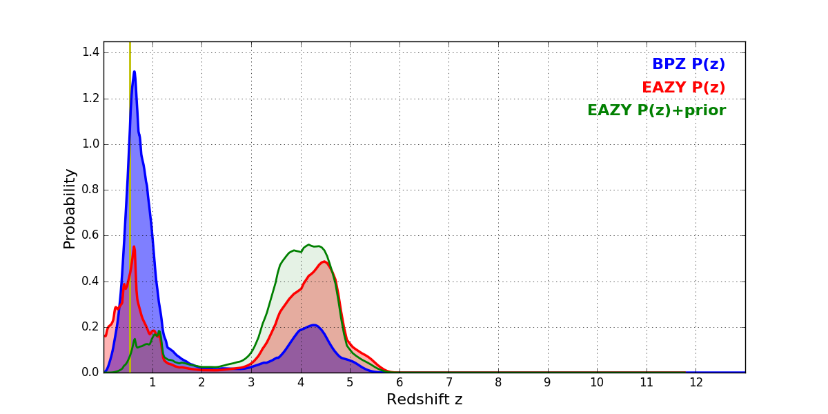 In P(z) plots: Yellow lines mark the cluster redshift z = 0.546,