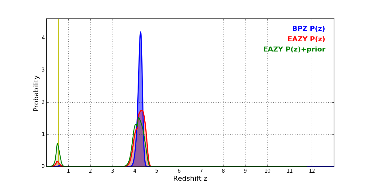 In P(z) plots: Yellow lines mark the cluster redshift z = 0.546,