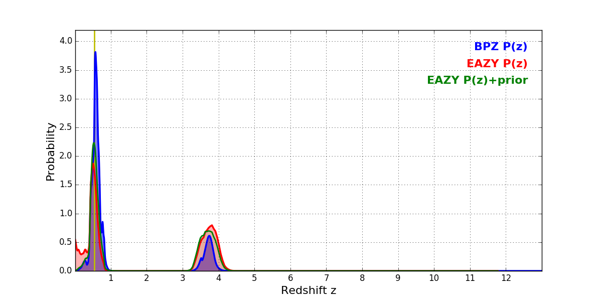 In P(z) plots: Yellow lines mark the cluster redshift z = 0.546,