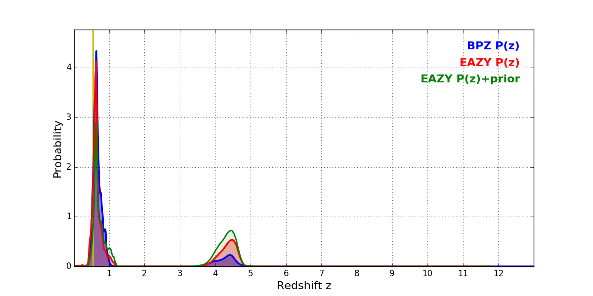 In P(z) plots: Yellow lines mark the cluster redshift z = 0.546,