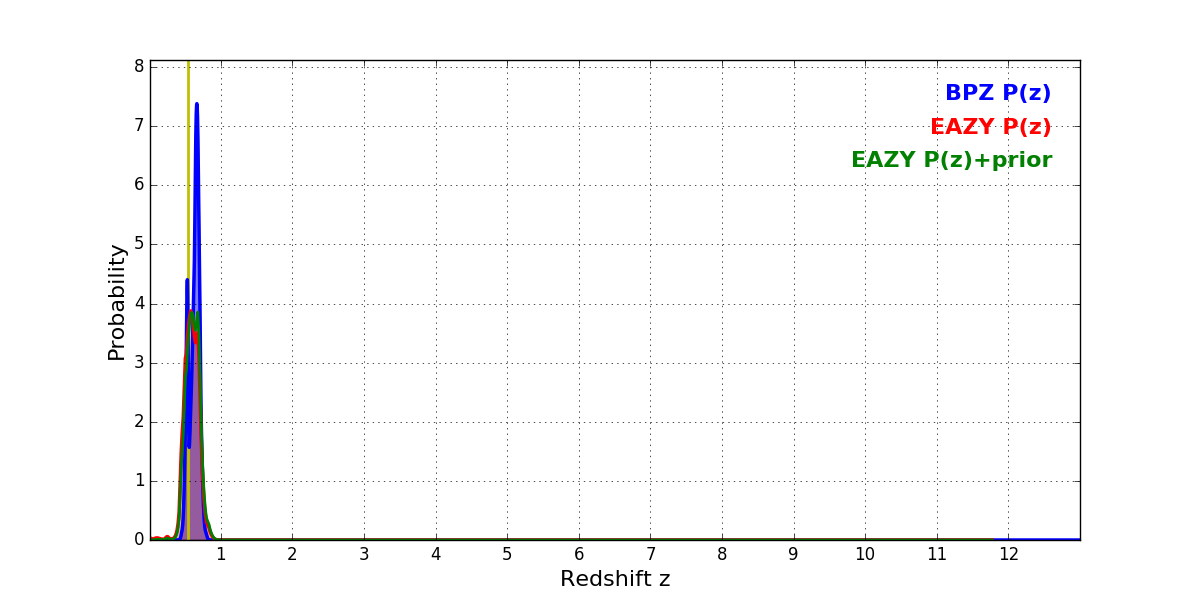 In P(z) plots: Yellow lines mark the cluster redshift z = 0.546,