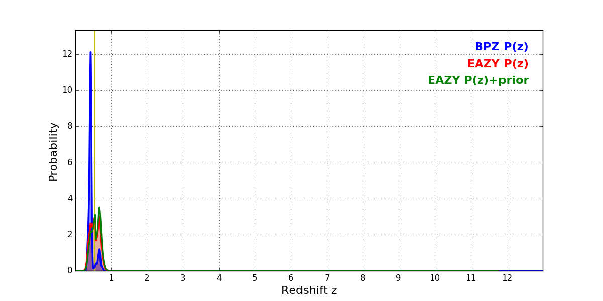 In P(z) plots: Yellow lines mark the cluster redshift z = 0.546,