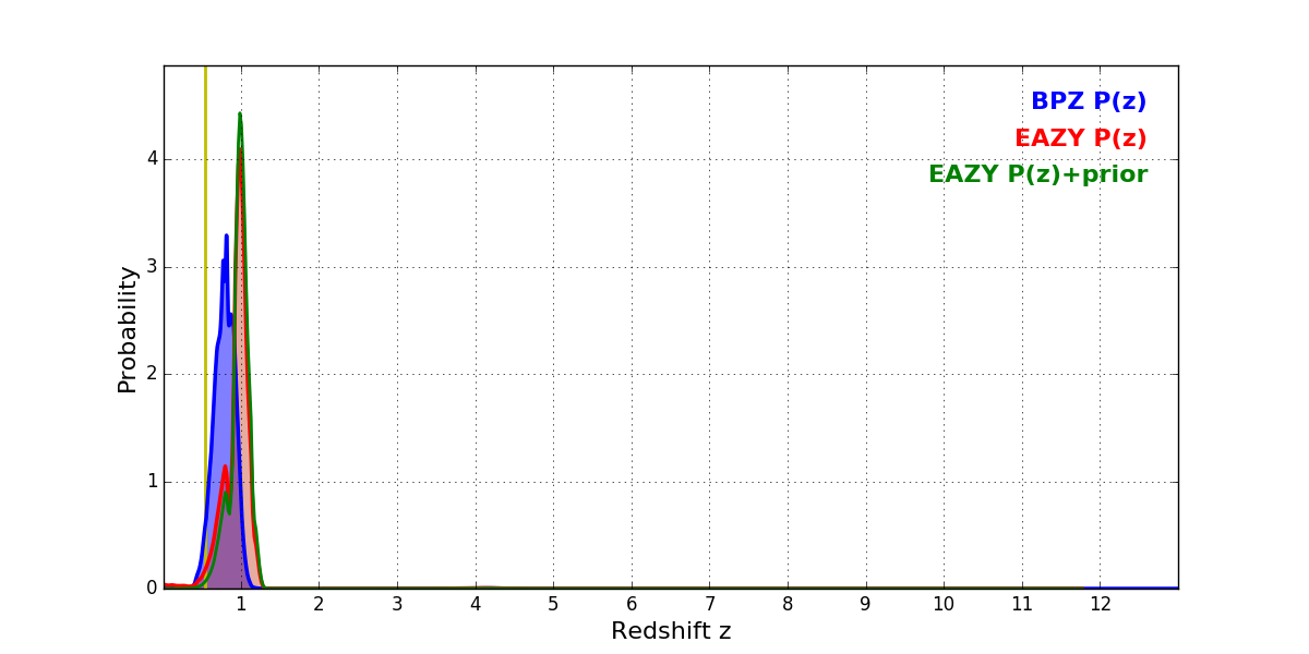 In P(z) plots: Yellow lines mark the cluster redshift z = 0.546,