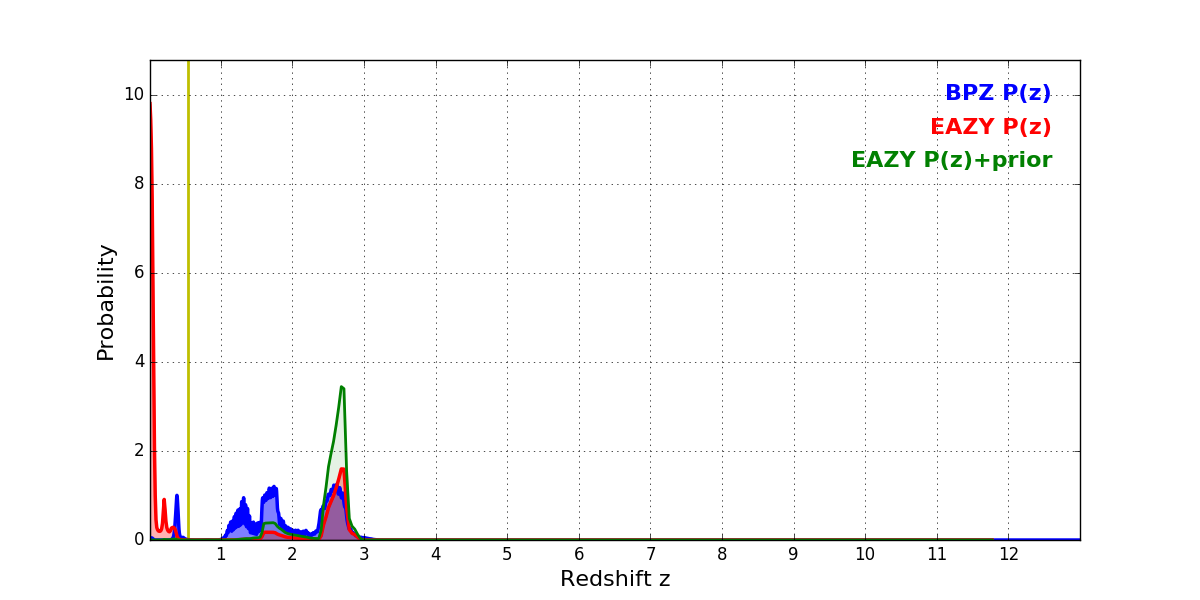 In P(z) plots: Yellow lines mark the cluster redshift z = 0.546,