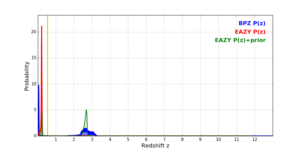 In P(z) plots: Yellow lines mark the cluster redshift z = 0.546,