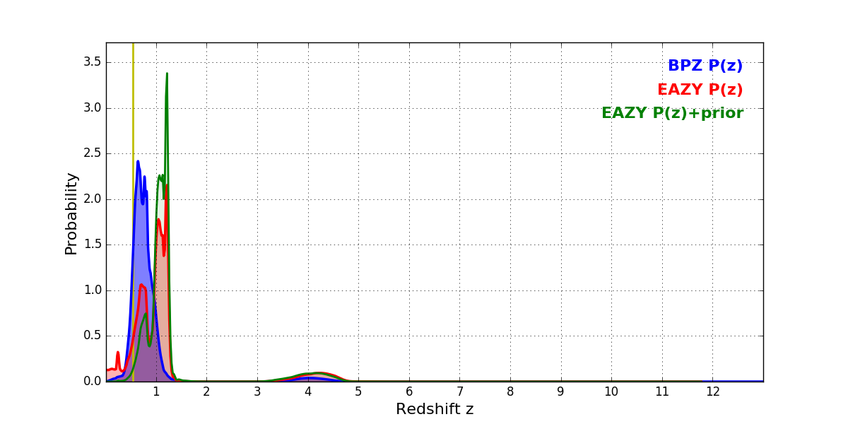In P(z) plots: Yellow lines mark the cluster redshift z = 0.546,