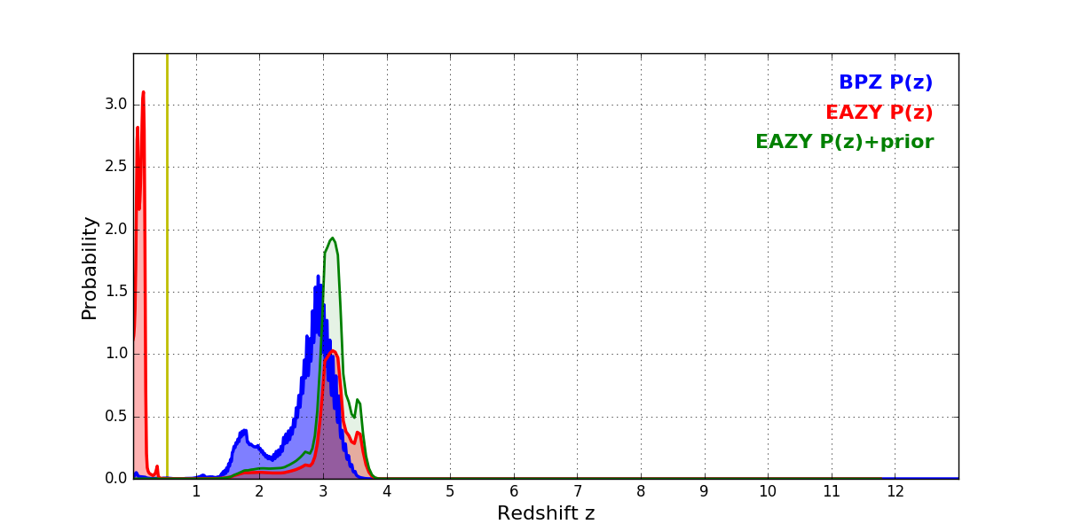 In P(z) plots: Yellow lines mark the cluster redshift z = 0.546,
