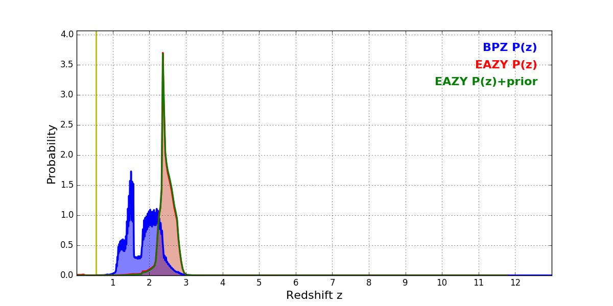 In P(z) plots: Yellow lines mark the cluster redshift z = 0.546,