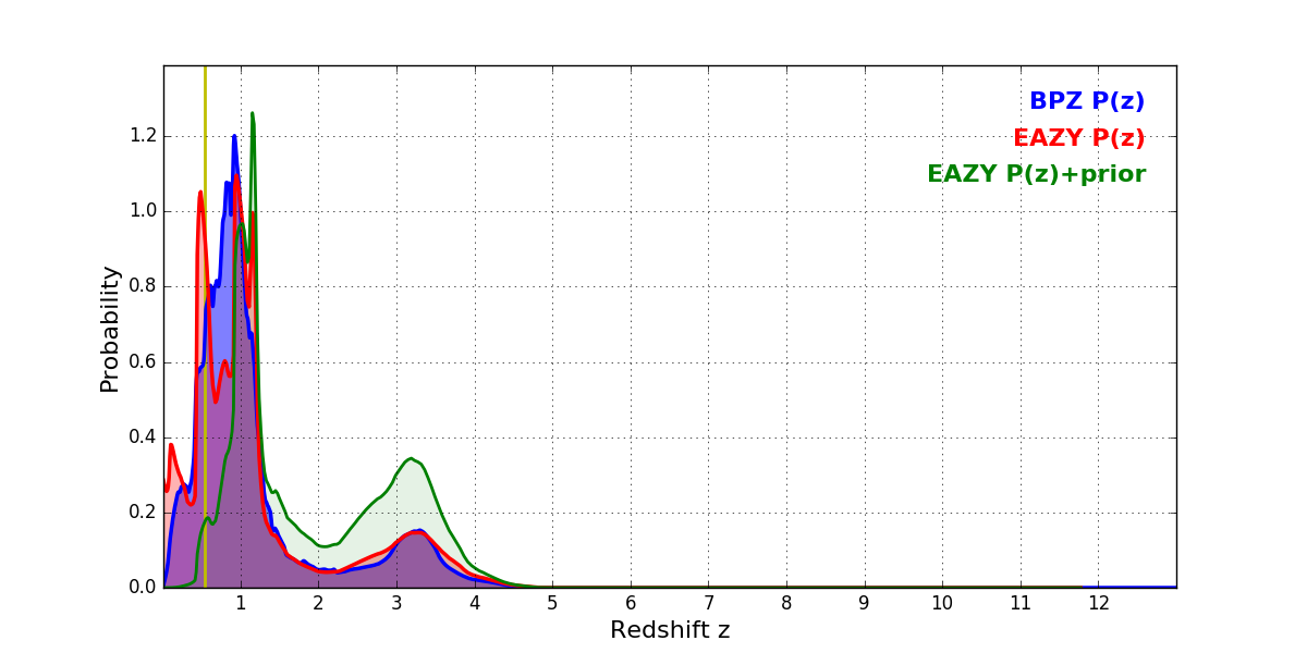 In P(z) plots: Yellow lines mark the cluster redshift z = 0.546,