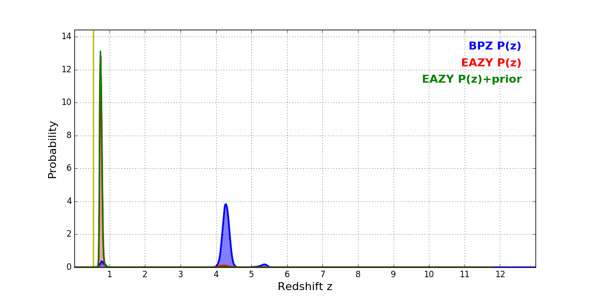 In P(z) plots: Yellow lines mark the cluster redshift z = 0.546,