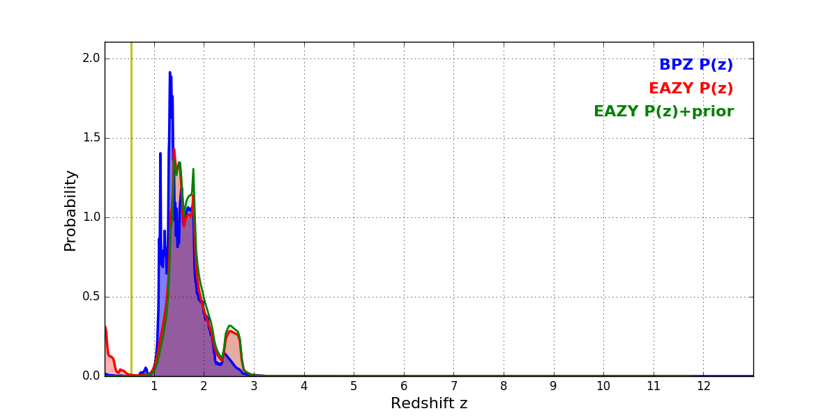 In P(z) plots: Yellow lines mark the cluster redshift z = 0.546,