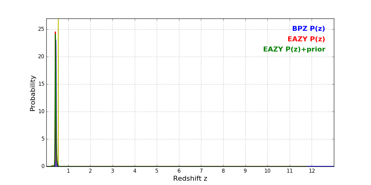 In P(z) plots: Yellow lines mark the cluster redshift z = 0.546,