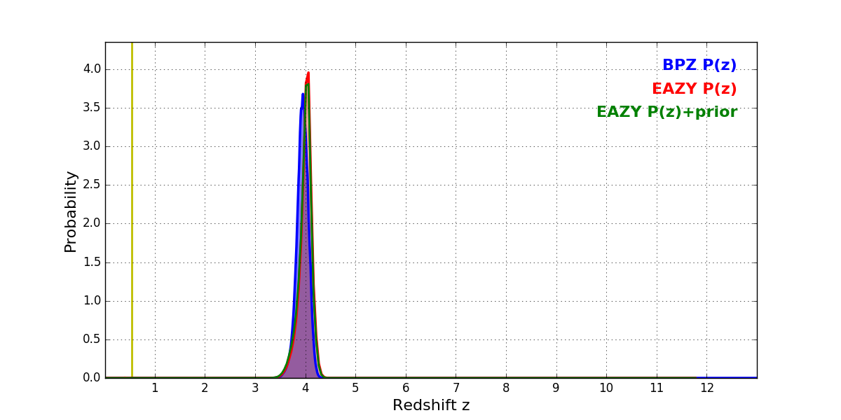 In P(z) plots: Yellow lines mark the cluster redshift z = 0.546,