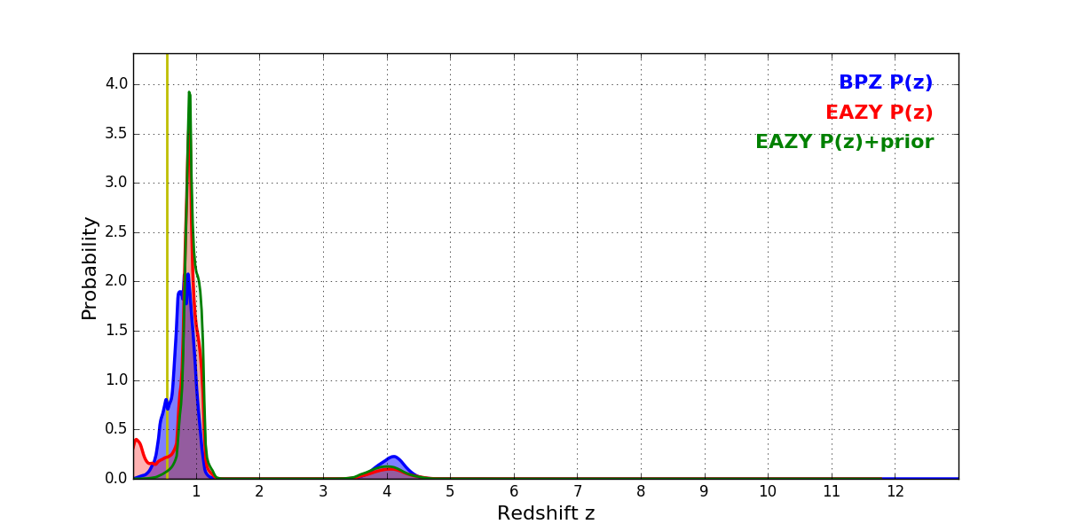 In P(z) plots: Yellow lines mark the cluster redshift z = 0.546,