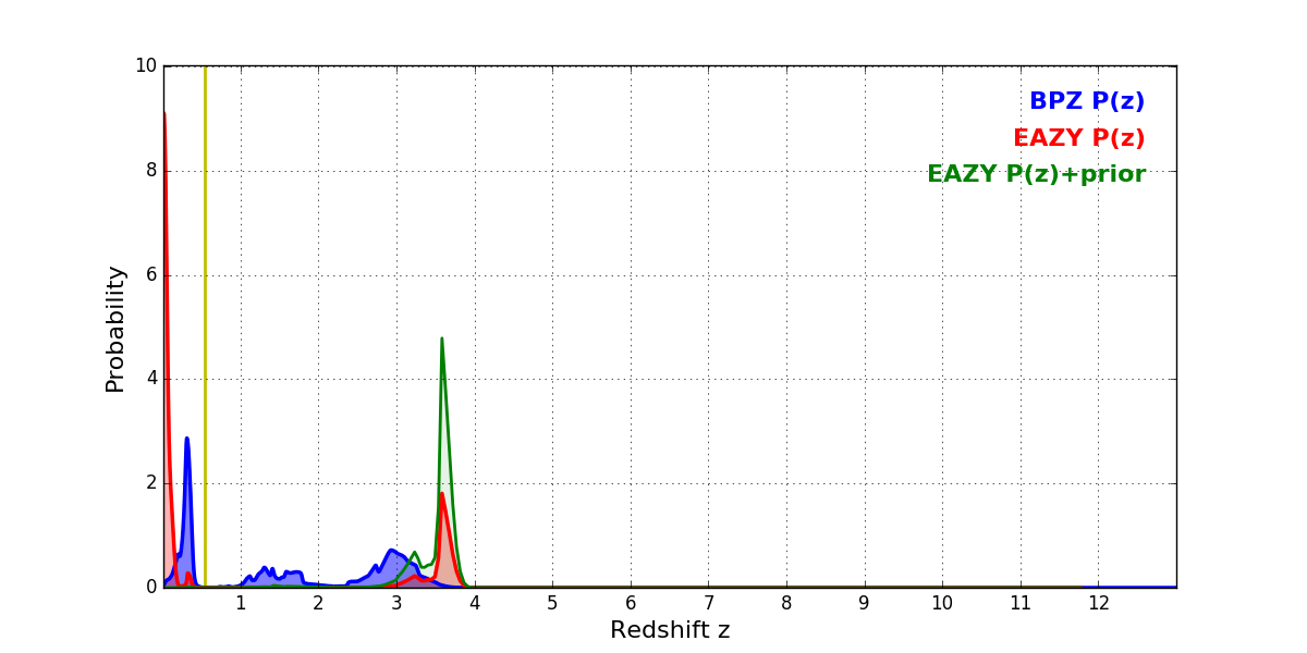 In P(z) plots: Yellow lines mark the cluster redshift z = 0.546,