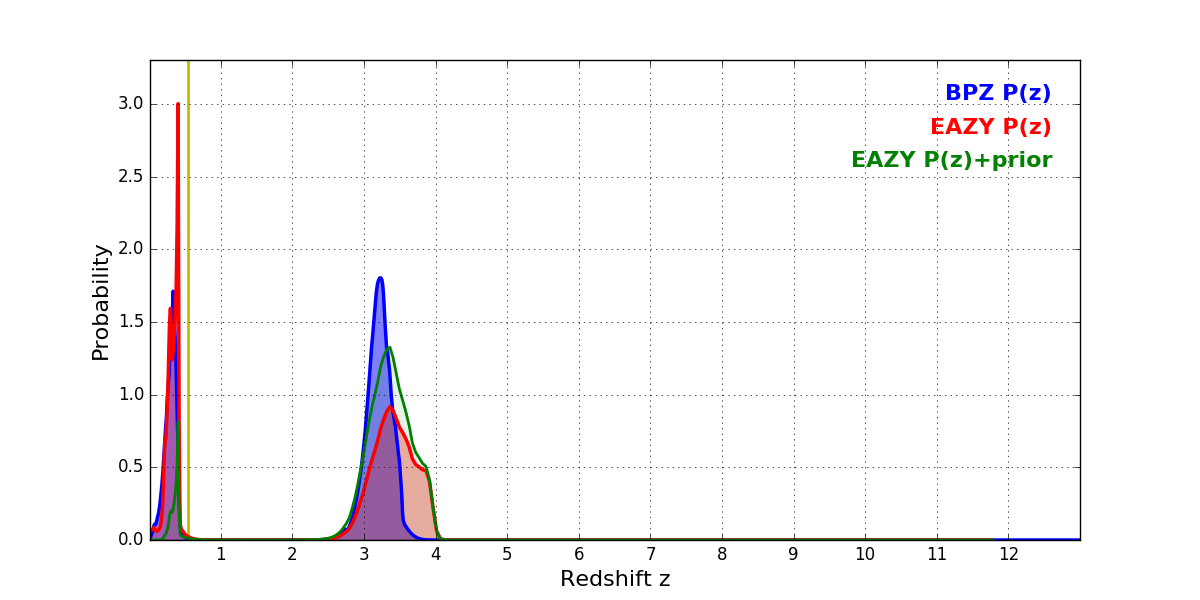 In P(z) plots: Yellow lines mark the cluster redshift z = 0.546,