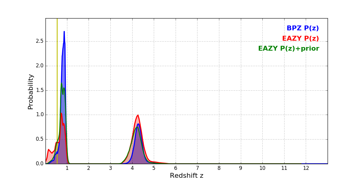In P(z) plots: Yellow lines mark the cluster redshift z = 0.546,
