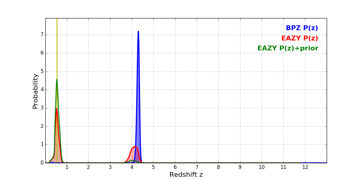In P(z) plots: Yellow lines mark the cluster redshift z = 0.546,