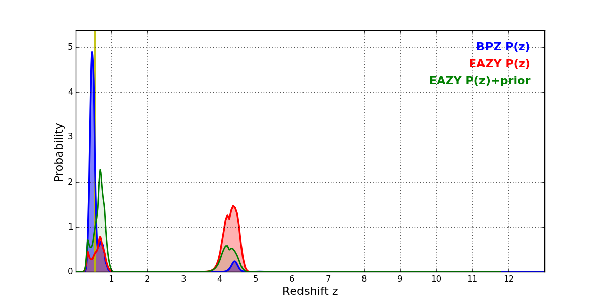 In P(z) plots: Yellow lines mark the cluster redshift z = 0.546,
