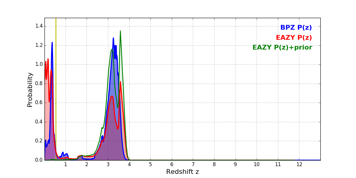 In P(z) plots: Yellow lines mark the cluster redshift z = 0.546,