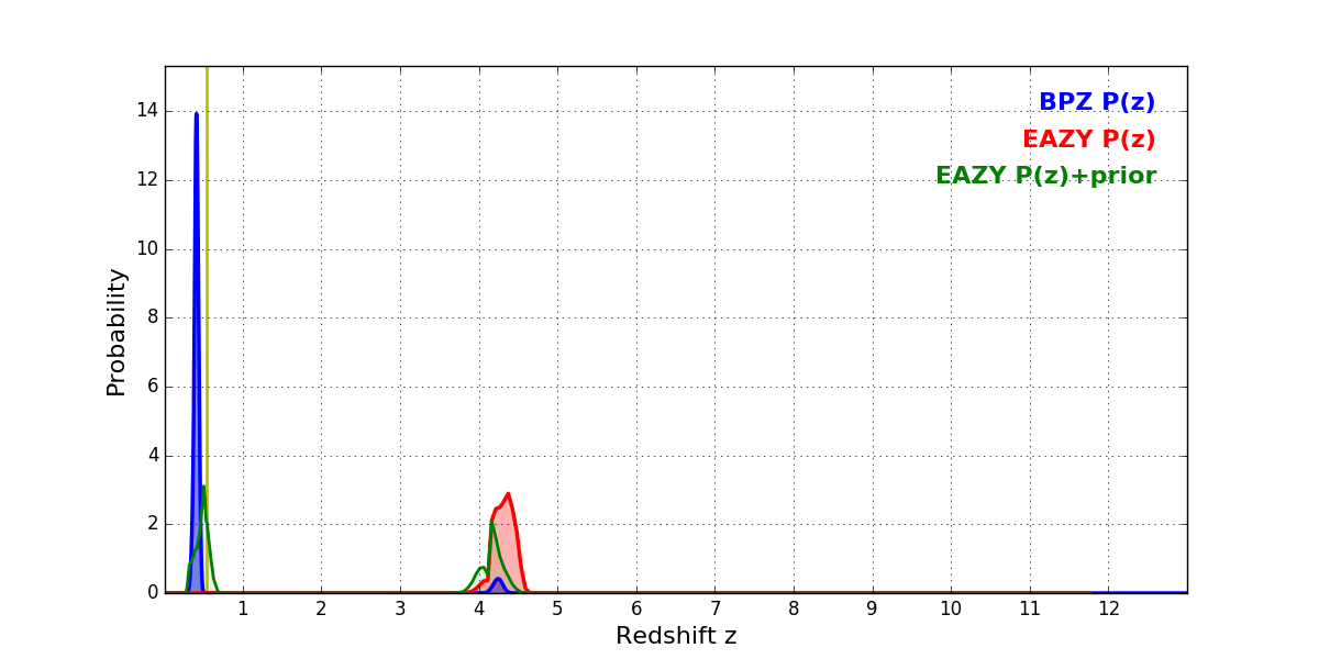 In P(z) plots: Yellow lines mark the cluster redshift z = 0.546,