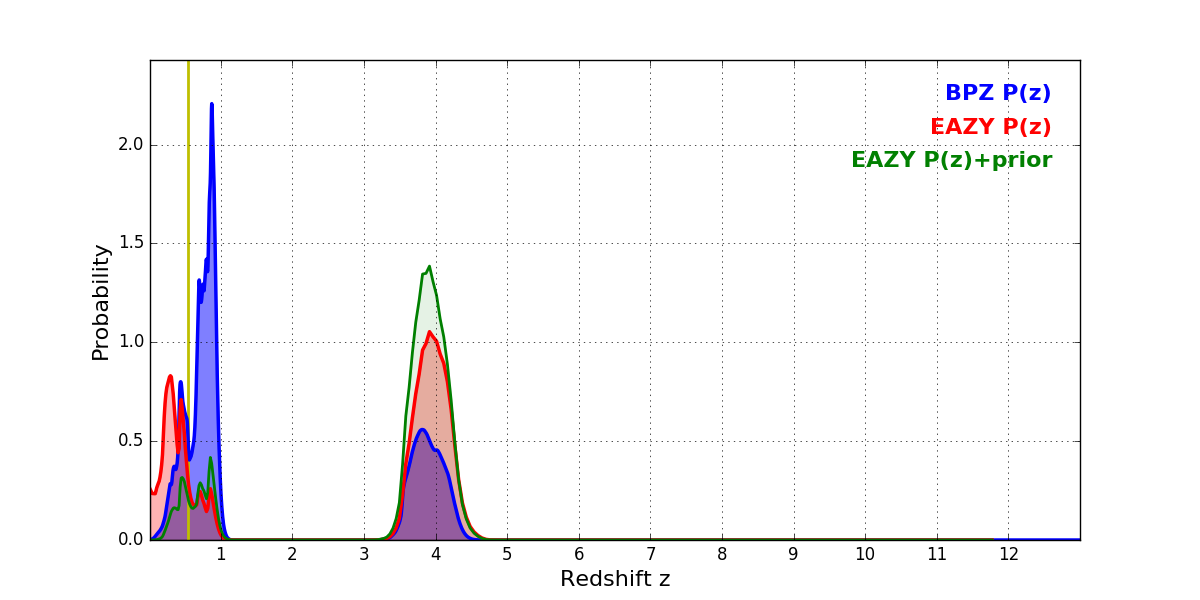 In P(z) plots: Yellow lines mark the cluster redshift z = 0.546,