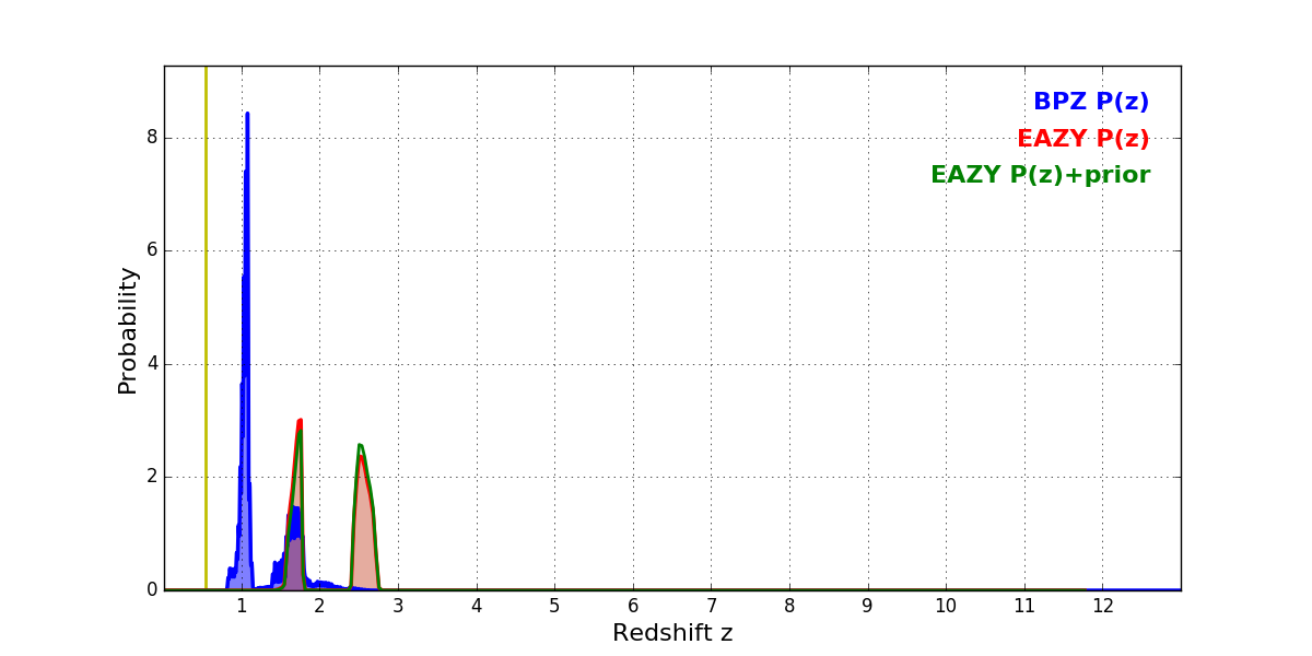 In P(z) plots: Yellow lines mark the cluster redshift z = 0.546,