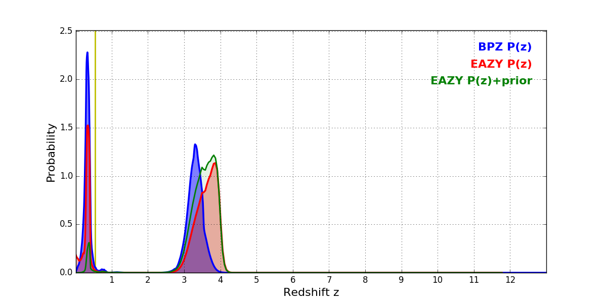 In P(z) plots: Yellow lines mark the cluster redshift z = 0.546,
