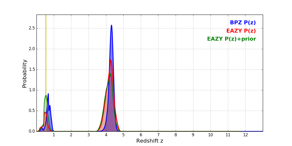 In P(z) plots: Yellow lines mark the cluster redshift z = 0.546,