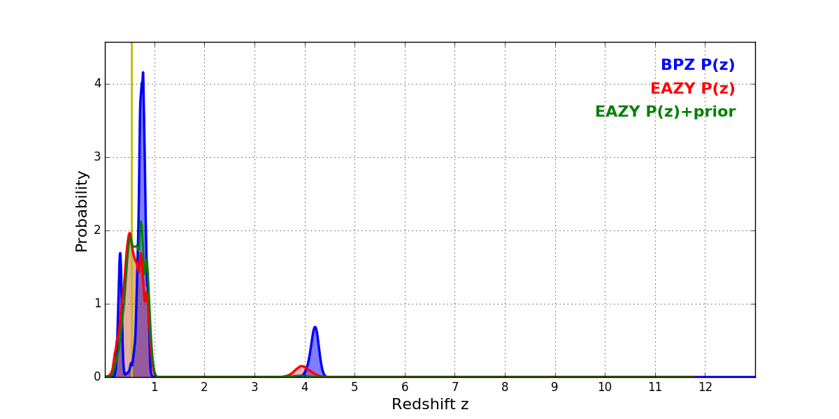 In P(z) plots: Yellow lines mark the cluster redshift z = 0.546,
