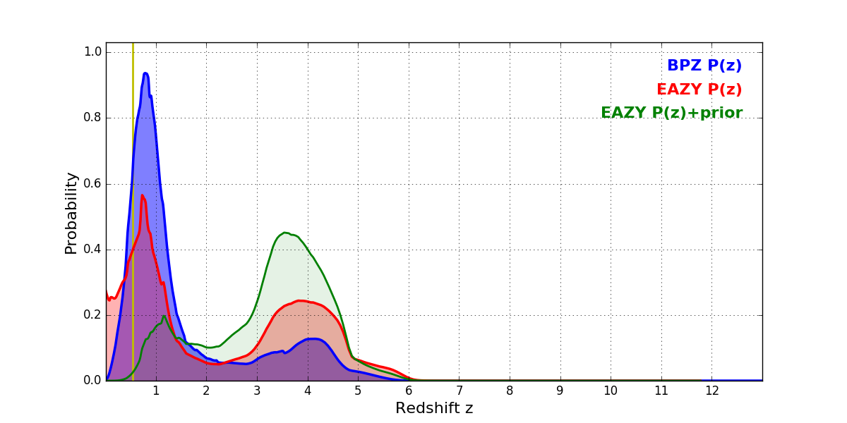 In P(z) plots: Yellow lines mark the cluster redshift z = 0.546,