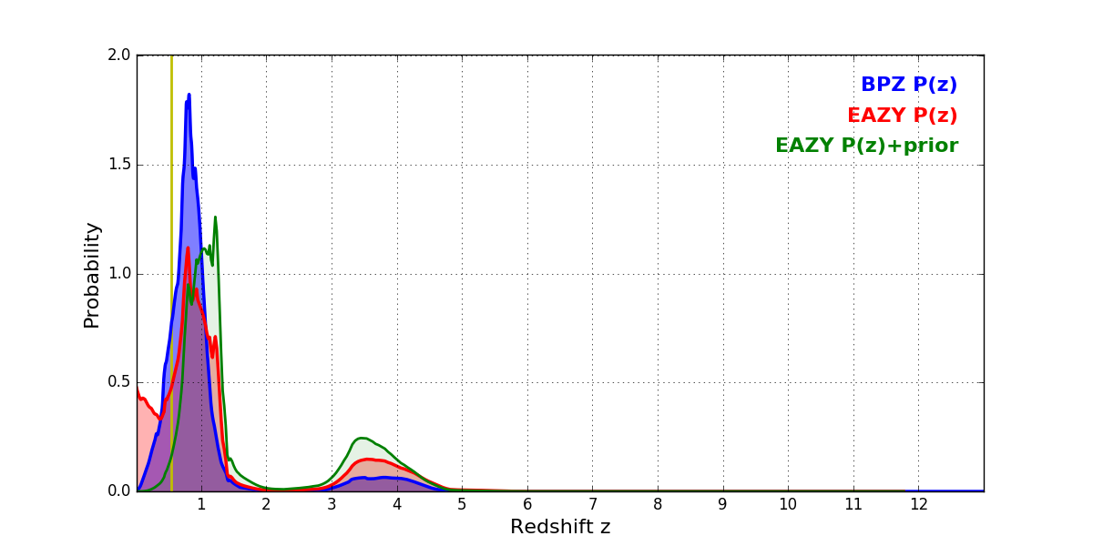 In P(z) plots: Yellow lines mark the cluster redshift z = 0.546,