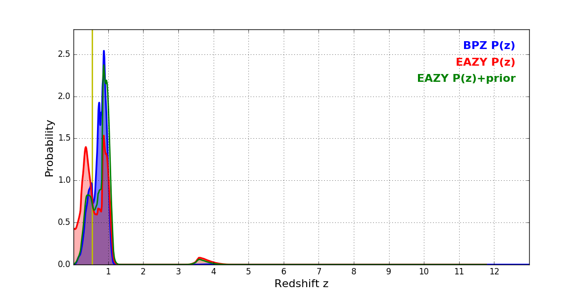 In P(z) plots: Yellow lines mark the cluster redshift z = 0.546,