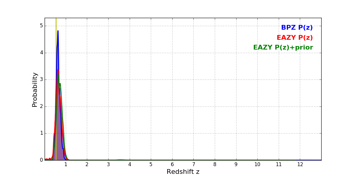 In P(z) plots: Yellow lines mark the cluster redshift z = 0.546,