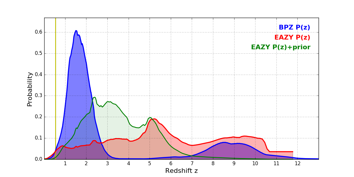 In P(z) plots: Yellow lines mark the cluster redshift z = 0.546,