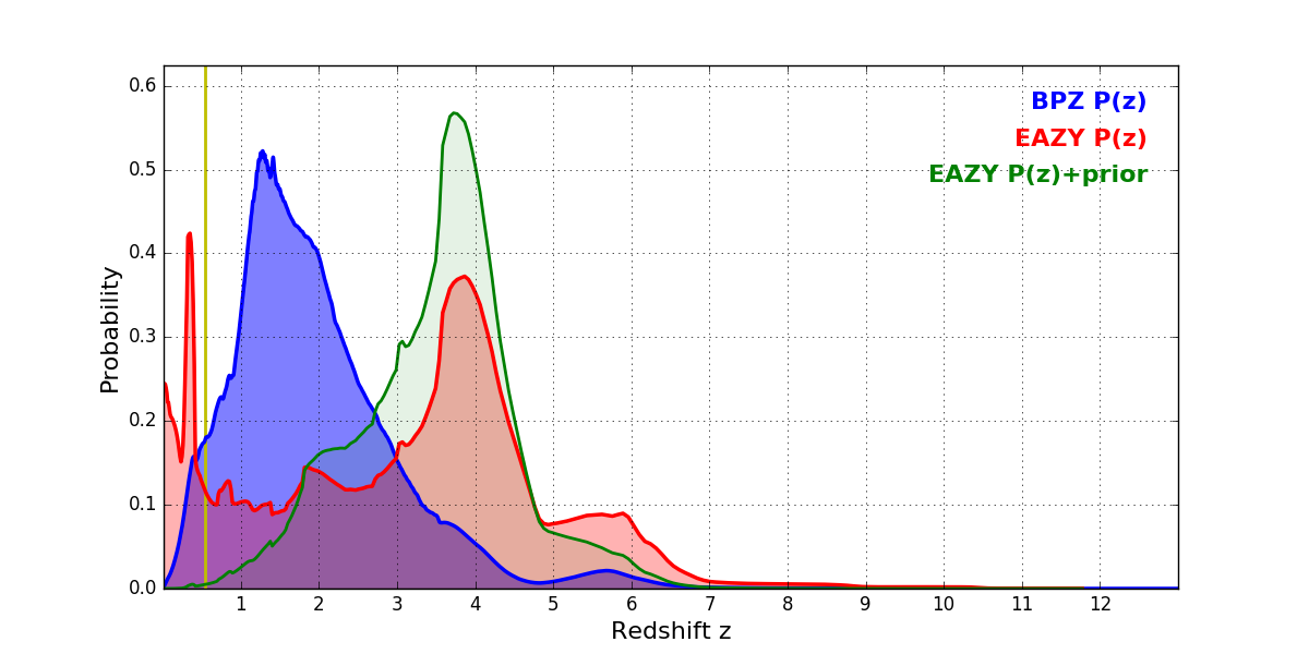 In P(z) plots: Yellow lines mark the cluster redshift z = 0.546,