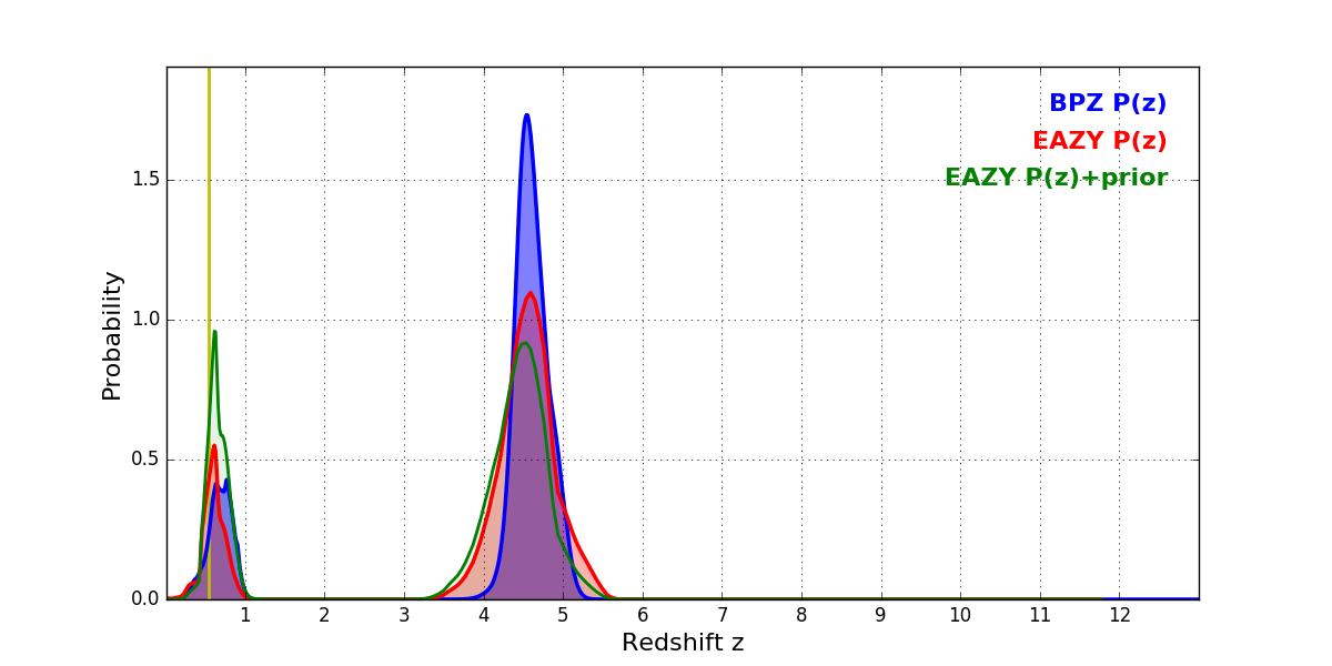 In P(z) plots: Yellow lines mark the cluster redshift z = 0.546,
