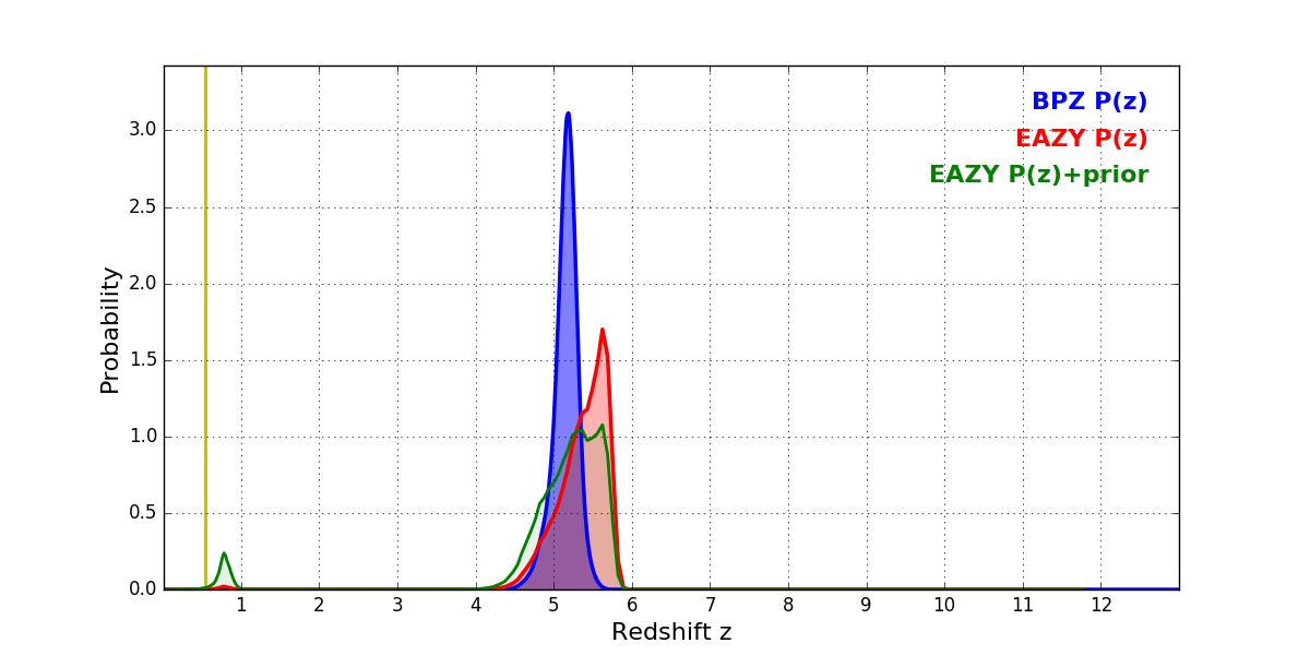 In P(z) plots: Yellow lines mark the cluster redshift z = 0.546,