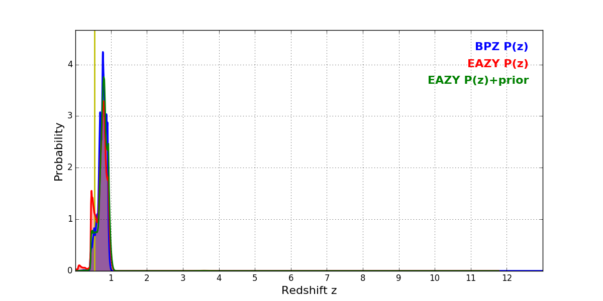 In P(z) plots: Yellow lines mark the cluster redshift z = 0.546,